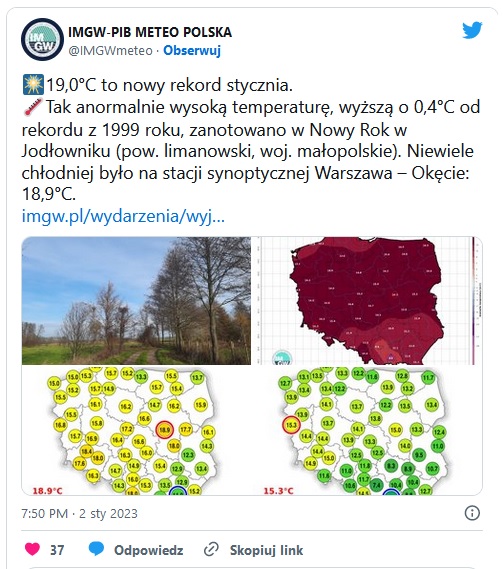 Początek nowego roku zaskoczył wyjątkowo ciepłą pogodą. Poniedziałek był kolejnym bardzo ciepłym dniem. IMGW informował na Twitterze o nowym rekordzie ciepła w styczniu.