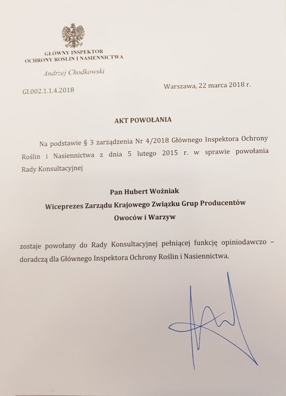 Poniżej akt powołania dla Pana Huberta Woźniaka